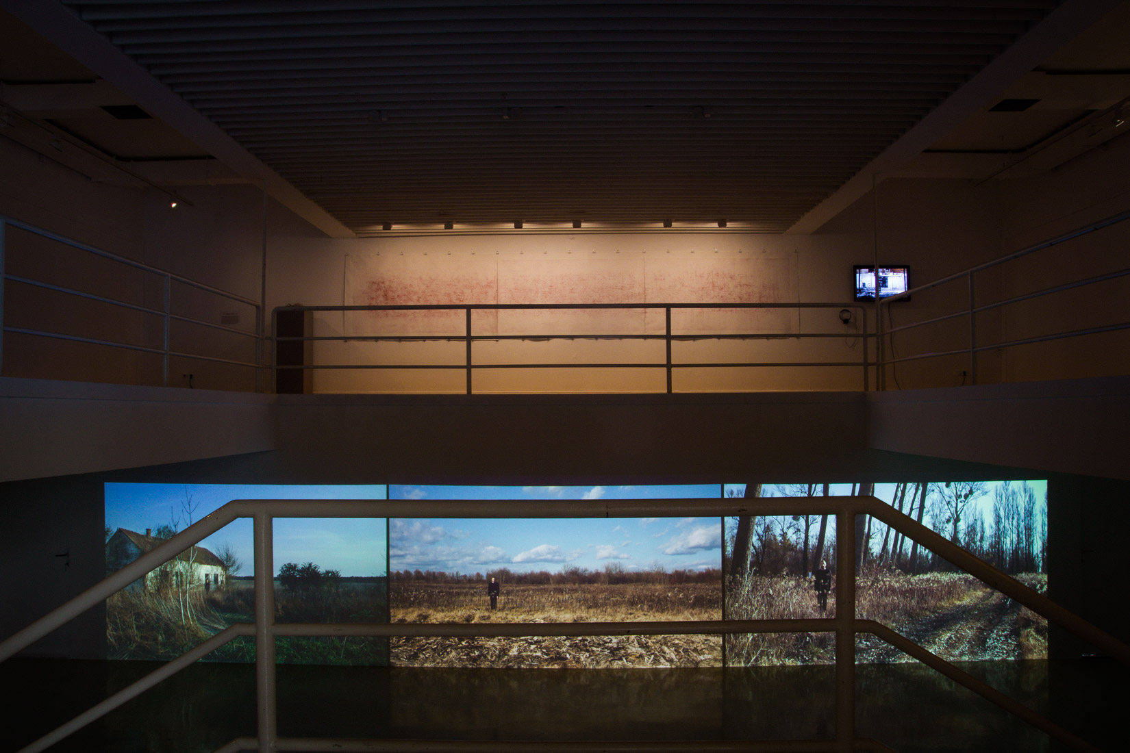The three-channel video installation presents us with three different spaces, three exteriors which form one compositional whole. The view is dominated by the line of the horizon, metaphorically speaking a line that directly alludes to the abovementioned resignation, almost a lifelessness. Aside from the dominant image, i.e. the video, a key part in this work is also given to the sound which has been recorder in situ, and as such potentiates the loudness of the figure who is observing the visitor of the exhibition. In each of the spaces the static figure (the observer) who observes the situation is present and, by observing the visitor, presents them with a question of “where and how to move on?” I problematize the “observation” (of violence, education, problems, people…) and the static attitude in moments when a reaction to a particular problem is needed (social, economic, communal…). How much longer are we ready to observe while situations arise around us that directly or indirectly reflect on our present or future?
