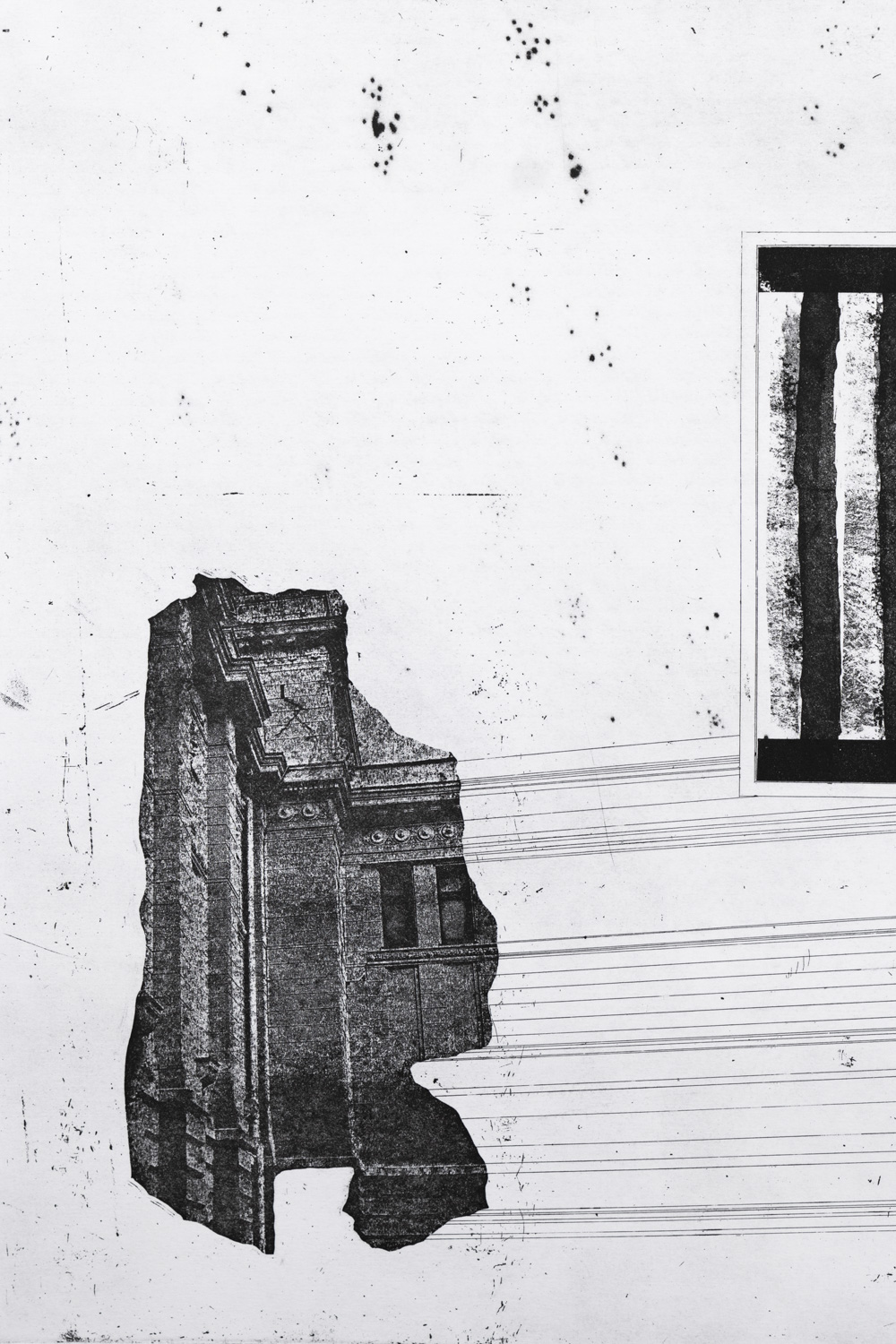 Taking into account the socially engaged topics with which I often deal, in this work I try to move away from them and let go during the working process, which Kožarić points out as one of the most important. Thus, visiting the currently non-functioning building of the Art Pavilion in Zagreb, I see the cracks created by a natural disaster and photograph them, approaching them as fragments of drawings that the earthquake left on this monumental building. In this act, I place the fragments of the building on which the damage is visible as pedestals for some new solutions and artistic ideas that grew out of the disaster. In the graphic process itself, I exploit these fragments, transfer them to zinc plates and place them almost like historical artifacts (both conceptually and visually), recompose and deconstruct them for new construction. Writing down this idea also implies that the bearer of the work becomes part of a damaged and currently non-functional building that is important for national culture and art. Furthermore, there is the possibility of realizing concepts and ideas in reality, which unfortunately is not realistic in accordance with the relationship of our society towards culture. This process also deals with one question that Ivan Kožarić often mentioned, namely “How far does freedom go?”. It may be constantly right next to us, but few have the courage (like Kožarić) to experience it.