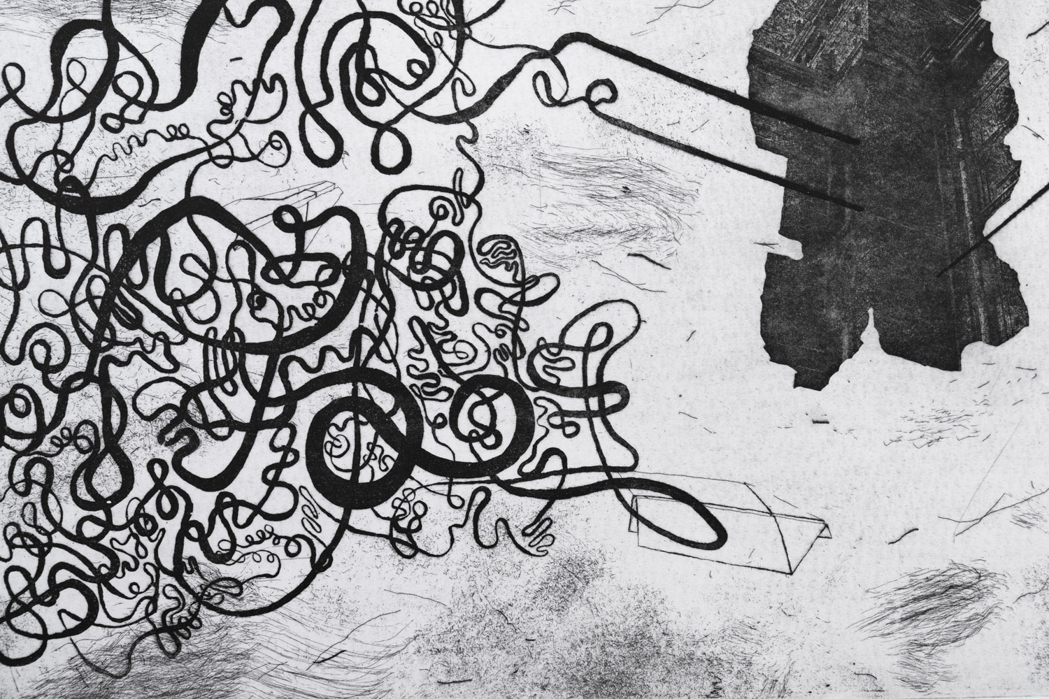 In a series of 7 prints, I play with the border between the work of art and what precedes it, and this is an idea that in my working process I first document work in the form of the so-called sketch. With the presented works, I directly try to erase that border, not burdening myself with the previous order of creation, but directly “drawing” the idea with interventions on the zinc matrix, a template that serves for the realization of a graphic print. Furthermore, there is a game in the form of the etching of the plates, where the length of the etching determines the tones, thickness of the lines, and other effects or, more precisely, technical data by which we often define graphic art as a technical medium. Researching the mentioned approach to creating a work of art, I came across several authors who, with their lucidity, on the one hand, knowledge and playfulness on the other, occupy my focus, above all that is the eternal Ivan Kožarić who approaches artistic activity with a touch of unburdenedness (Freedom is A Rare Bird).