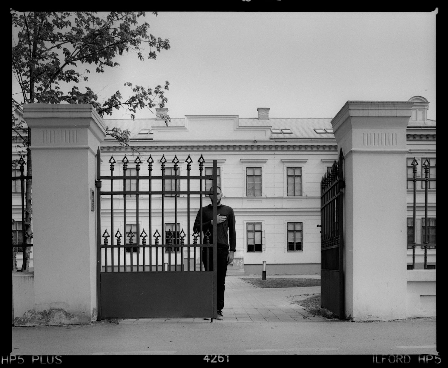 A series of ten analog photographs made at different locations that have been directly affected by the war-time destruction in the last decade of the previous century. The chosen locations have in their heyday been, and some still are, focal points of social life of the community, which had functioned as such. Buildings such as a family house, educational institutions (elementary school, faculty), industrial facilities, and churches, have all, in their time, represented an integral part of the society that had occupied those spaces day in and day out. By the act of war, i.e. destruction, all of the buildings have been reduced to a state of being unrecognizable, repulsive and, in a way, remind us of “something we do not want to remember,” which has direct effect on the homogeneity of the community and disunity, and serves as a reason to constantly point fingers at someone. Some of the presented buildings serve their original purpose even today, such as Nikola Andrić Elementary School in Vukovar, where the disunity between ethnic groups is being potentiated to the extent that our youngest are being exposed to psychological violence in the context of disunity, as well as having daily encounters with the scars of destruction since their earliest age. The question that comes out of this is one of man and his morals who, aware of the destruction of the past, even more aware of the present, still, with full awareness, immorally trudges towards the future. A human figure in each of the photographs has closed eyes, and is holding his hand over his heart; he is static, frozen in time which, as it is to be assumed, will never make a turn for the better. The very act of putting one’s hand over one’s heart can be interpreted as pride, as it is most commonly interpreted, as sadness which is evident or, in the end, as resignation towards the observed condition.