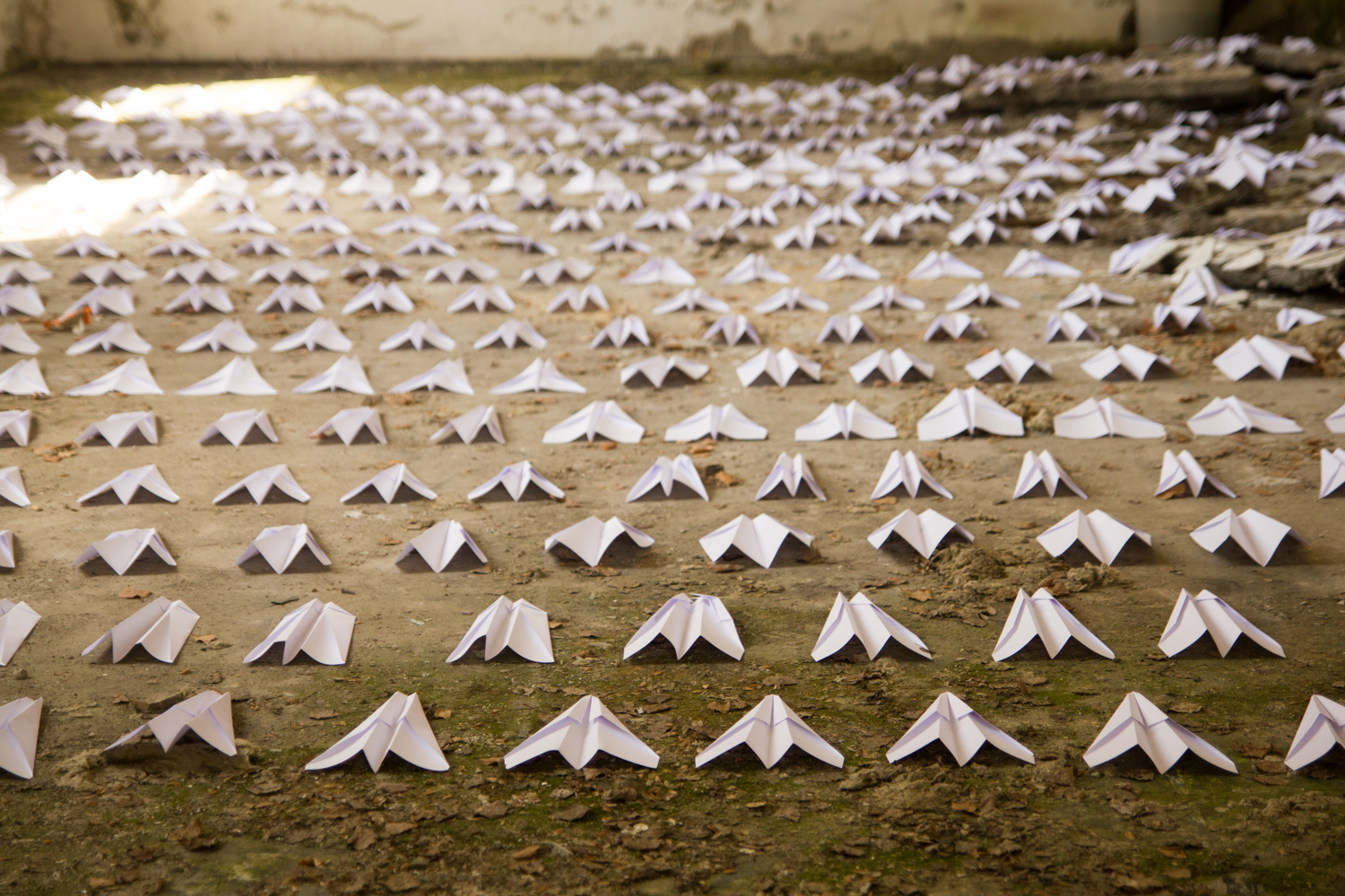 The work problematizes the state of our society and the disinterest of the government for the reality in which we find ourselves. The state of the matter tells us that we have more pressing and greater problems than the purchase of an old-timer-aero fleet, so I pose a question to myself of the relevance and importance of investing astronomical amounts in an area which is so unprofitable. On the other hand, the problems in other sectors (education, economy, emigration…) are enormously larger, and are given far lesser amounts for their salvation, not to mention providing the necessary equipment needed in particular sector. I ask myself whether this is a characteristic of a country that is to be “among the most developed countries of the European Union and the world,” and whether the strategy of (potential) development is, in fact, somewhat hypocritical?!In my own visualization, I evoke memories of my childhood; creating paper airplanes and enjoying their winding flight. Today I have landed them on the ground, i.e. in a decrepit room of a derelict factory which still bears the smell of rot of the times that are behind us, and which should stay there. The airplanes are, of course, made by hand, and are completely unique, fragile; they do not fly to drop bombs and do not succumb to malfunctions. The time will tell whether the idea of white winding flyers will see the light of day or whether we will, as we always do, let the state impose itself as the Homo Ludens with an unquenchable thirst for play which is, in this case, questionable but unquestionably hypocritical.