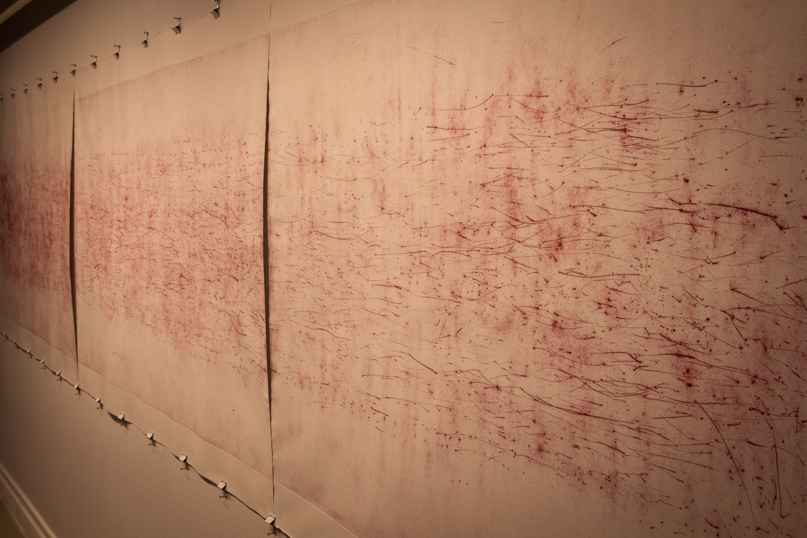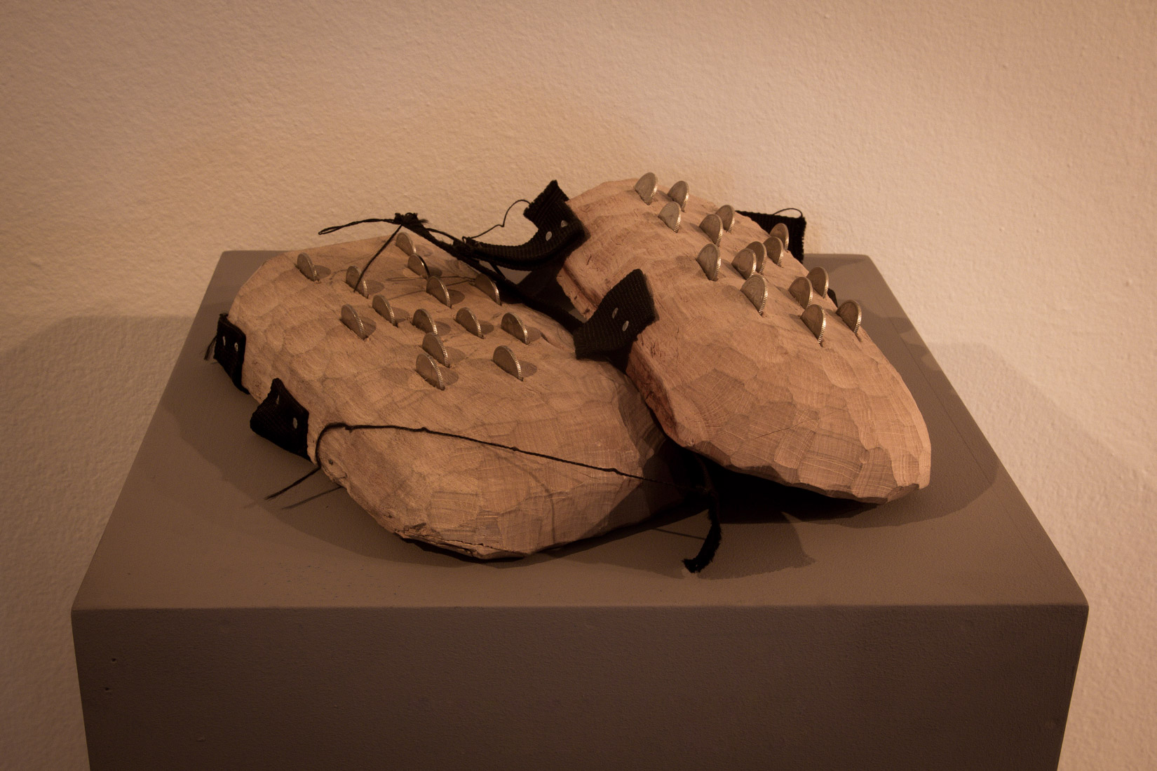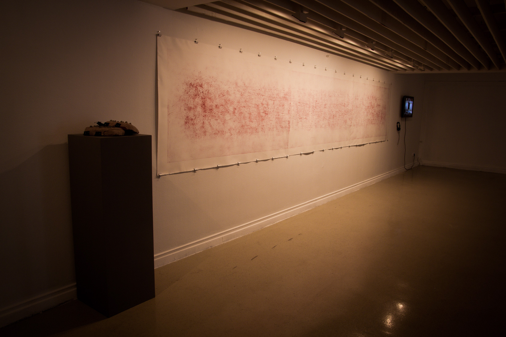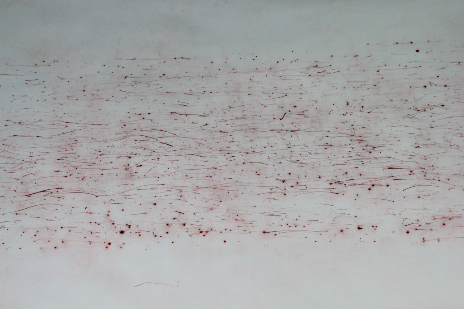 There are several important items in this work; knee protectors sculpted from wood in which there are about 30 one Kuna coins inserted, indicating the symbolism of the devastation in the context of privatization which has not, in most cases, been performed for the common good, and for the benefit of the community. With the performative act of kneeling that turns into movement, I leave a trace on metal sheets with those same Kunas which is, in this case, the trace of the people who have done their share for the community, working in and for it, while being driven into a state of uncertainty by the one Kuna. Furthermore, there is an emphasized upright position of the body as a sign of the respect for the monumentality of the building, a metaphor for stability and solidity. The bloody traces contrasting with the whiteness of the paper are created by printing the metal sheets, and the very monumentality of the print of the work projects a personal perspective on the importance of the problem of the disappearing city.